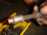 まずはエンジン下ろし、そしてスタンドに。 クラッチを点検。なんとレリーズベアリングとノーズが別物の組み合わせです。 直径が2mm違いなのでガタガタなわけですね。 そしてディスク残は2分・・殆ど無し。 フォーク、フォークシャフト共にさびて磨耗しています。 さてと、エンジン分解です。